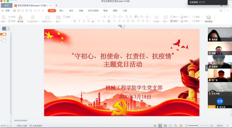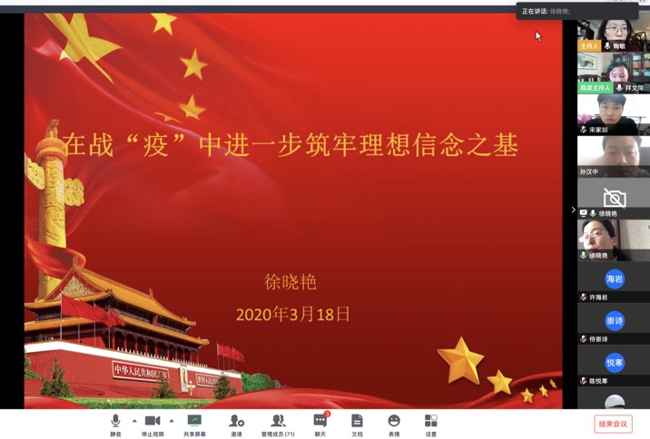 3月18日下午,pp电子官方网站学生党支部在线开展了“守初心、担使命、扛责任、抗疫情”线上主题党日活动。