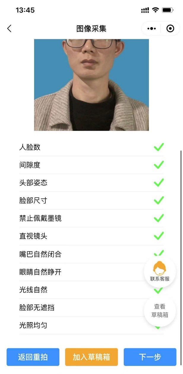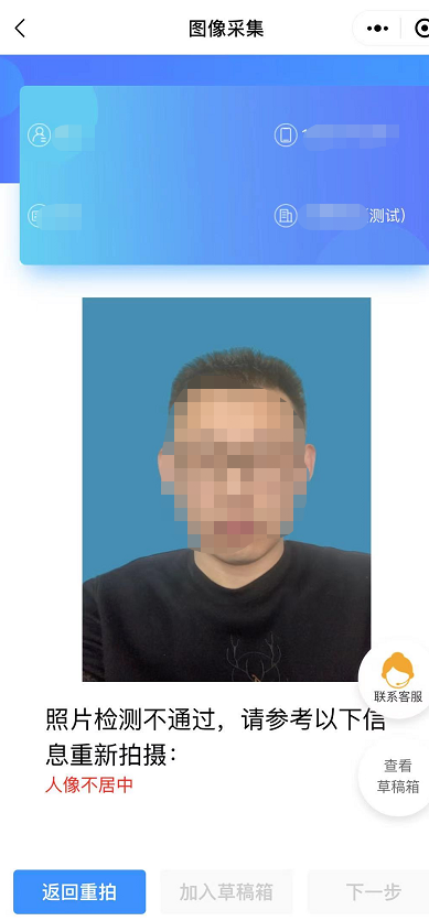 6)系统将已替换背景的照片呈现给学生,如不满意,可点击返回重拍,如满意可点击下一步,或加入草稿箱备用。