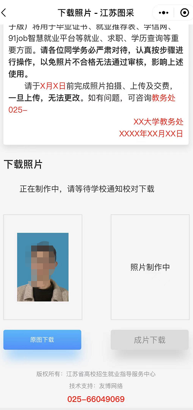 经报省物价主管部门备案,省招就中心将为学生提供电子图像采集、实名验证、后期制作、排版冲印、统一寄送等服务;为每位学生提供电子版照片和5张纸质照片;收费标准为15元/人(纸质照片和电子图像由省招就中心统一交付学校),在线提交照片时完成交费。