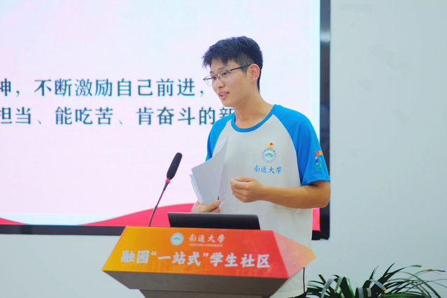“石榴籽”民族团结实践团队长赵艺讲述了团队开展“同心同向同行”民族交融实践系列活动的经历,展示分享了来自不同地区、不同民族学生家乡的风貌风情,用青年的视角讲述中华民族伟大复兴道路上家乡的发展变化,展现各族群众之间真情交融、手足相亲、守望相助的感人事迹,并分享了自己在通大校园中学业上的收获进步和生活上的成长感悟。